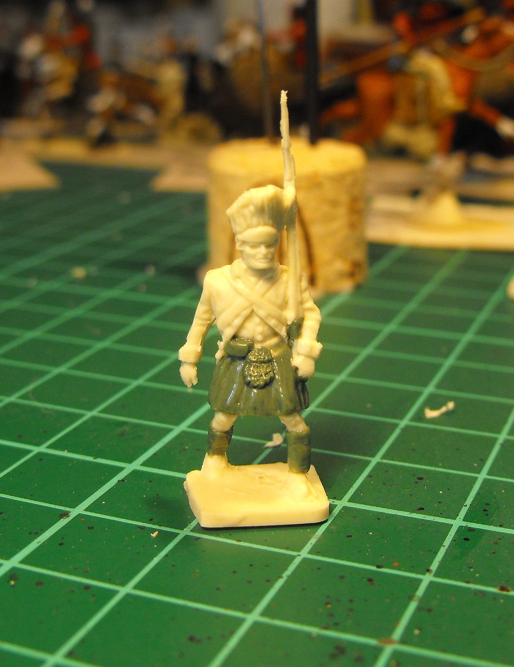 Kolejne ćwiczenie paluchów. Grenadier angielski - totalna staroć (1/72 Airfix) dostał trtochę masy, która ma go zmienić w Szkota. W tle widać gromadę Wołochów, którzy zaczynają się powoli kolorować ...